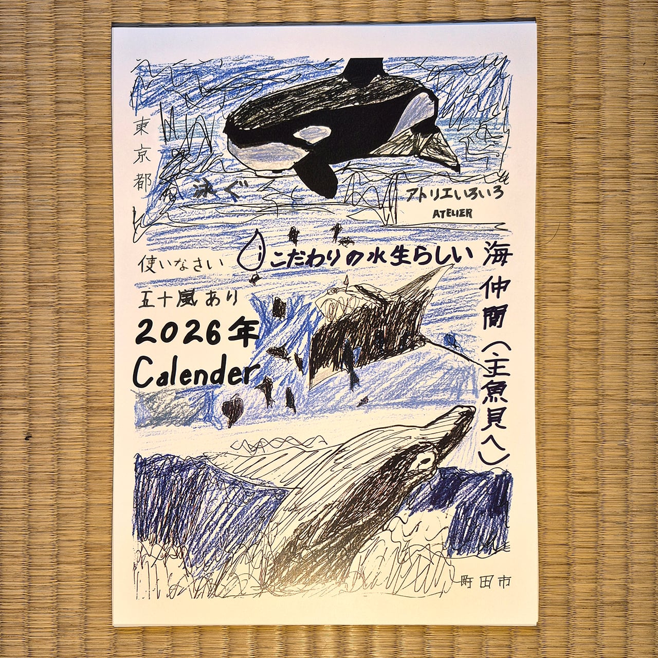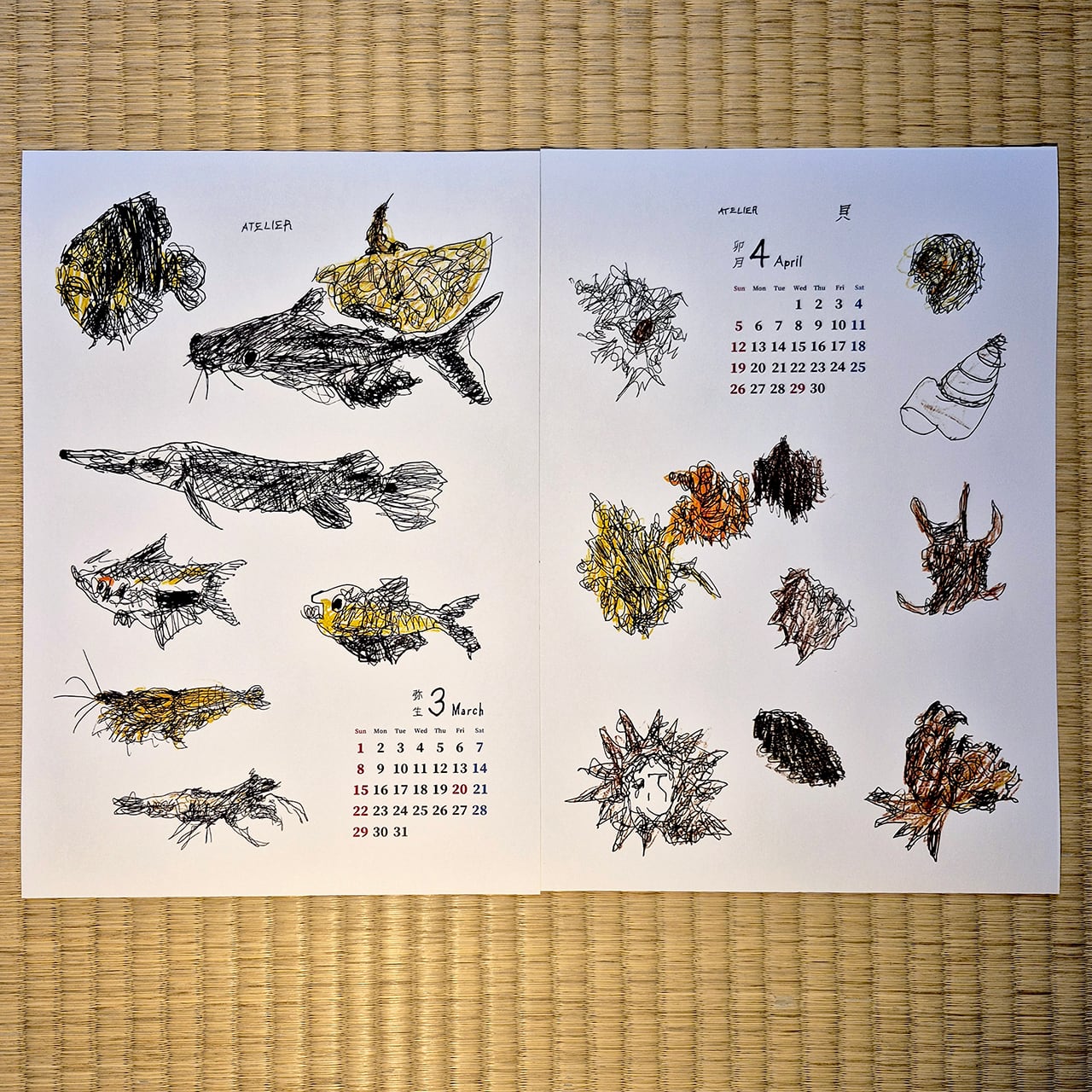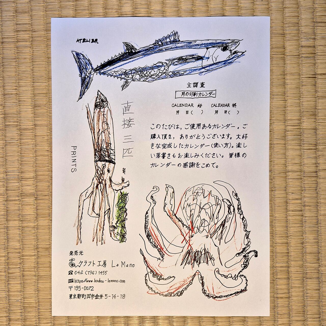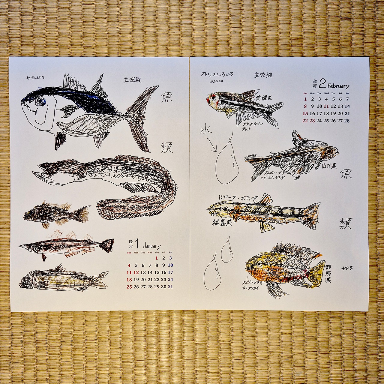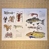 お待たせいたしました!La Manoのメンバー、五十嵐朋之さんが描く不思議なカレンダー、3年ぶりの登場です。毎年、昆虫、食べものなどテーマがきまっていて、今年は魚です。