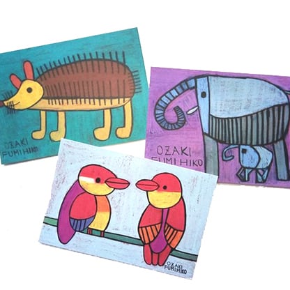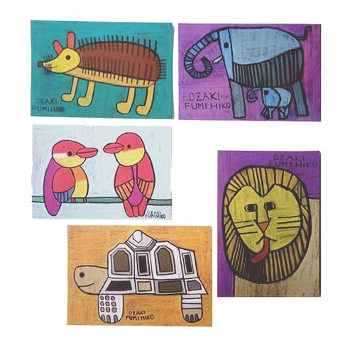 クラフト工房La Manoで絵を描き続けている尾崎文彦さんの動物の絵の絵葉書5枚セットです。