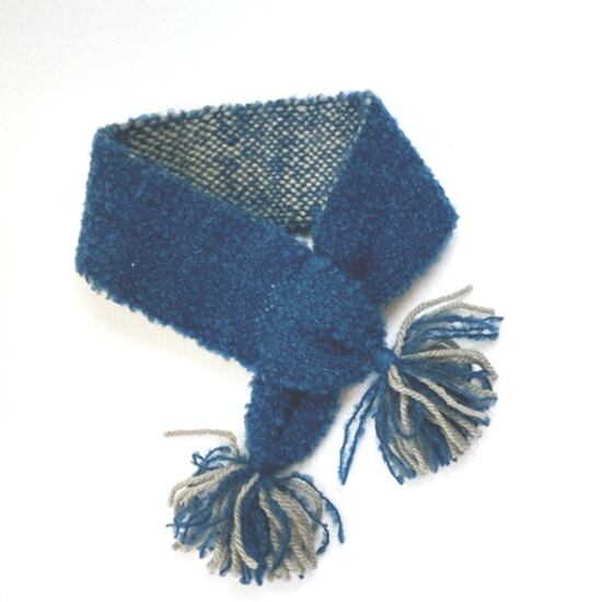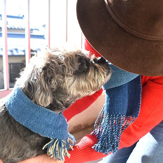 織りを得意とする、町田のクラフト工房La Mano(ラマノ)さんに、ワンちゃんと飼い主さんおそろいのマフラーを織っていただきました。糸は工房で染めた藍染め、そしてワンちゃん用のマフラーの織りはむずかしいワザが必要な「昼夜織り」という、裏表でツーフェイスになる織り方。これによって、マフラーの端を穴に通して着用できる形にできました。