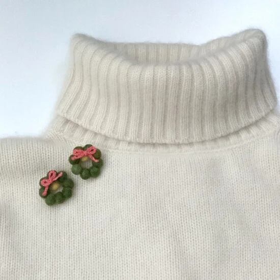 草木染にした原毛からひとつひとつ手作りしたボールをつないだグリーンのクリスマスリースに、ピンクのリボンを飾ったかわいいブローチ。小さいので、2つ着けてもステキでは?