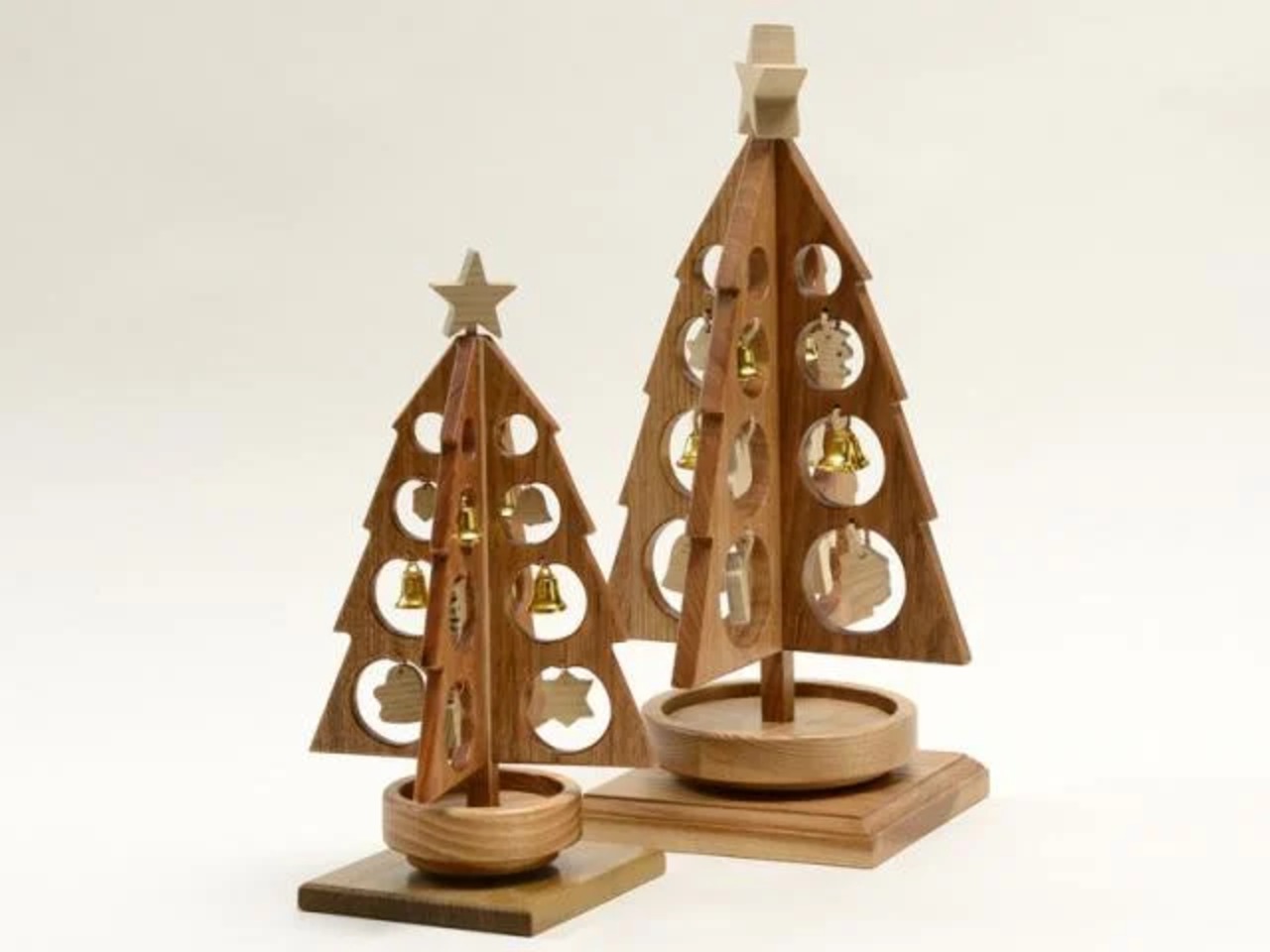 白木の小さなオーナメントにまじって、金色のベルがアクセント。ツリーをまわすと、リンリンとかわいい音がします。